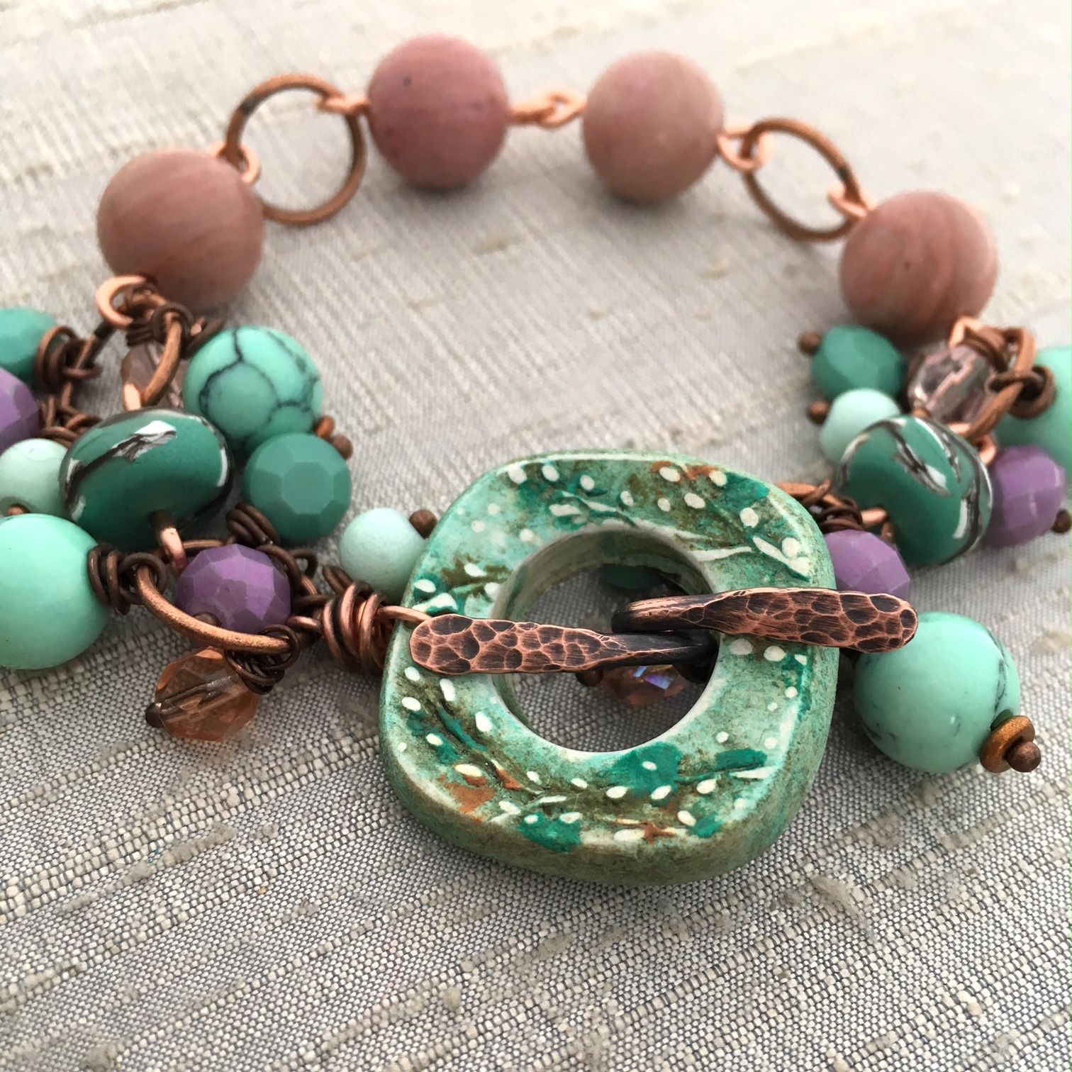 First up is a bracelet using stones and glass from Halcraft with a Humblebeads toggle and disk beads in coordinating colors. I used the Halcraft beads a fun dangles on the large copper jump rings. The heavy stones in the back help balance out the design and ensure my toggle with stay on the top of the wrist.