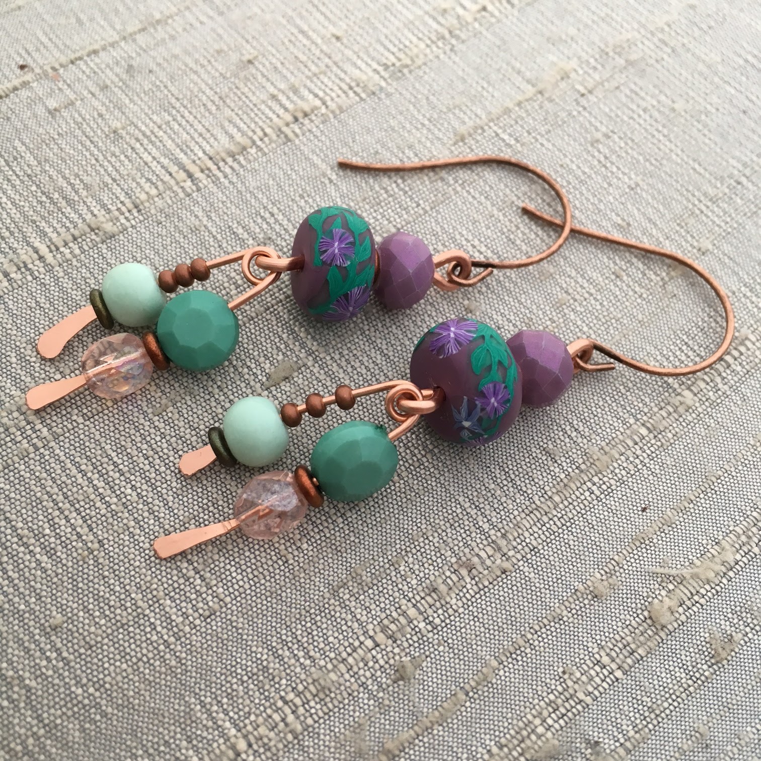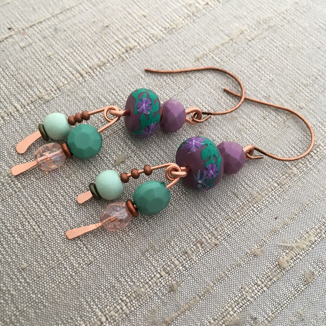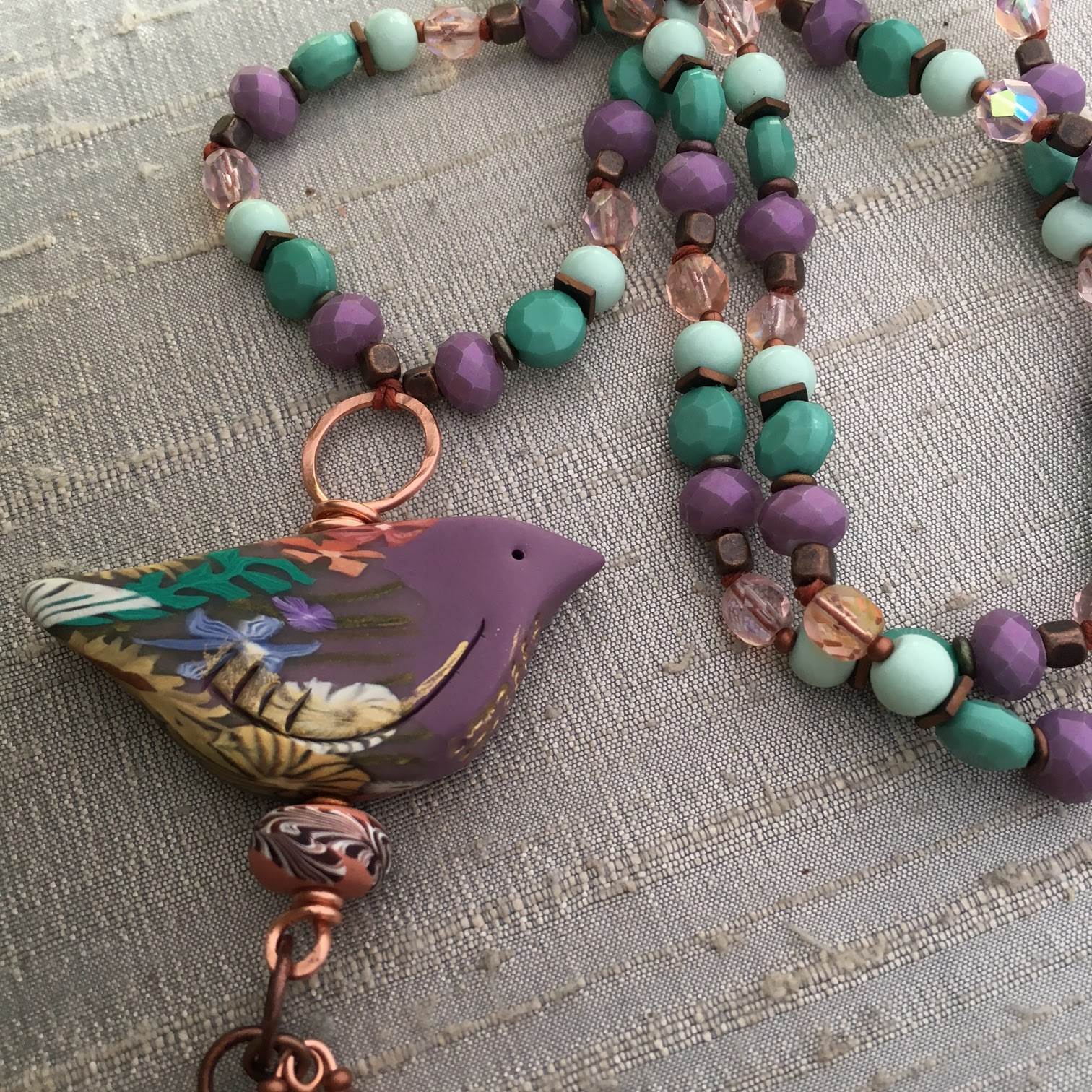 I created the bird with the colors from the challenge. I also used raw copper for a bright pop of metallic color in the necklace. I added in a few spacers in antique copper.